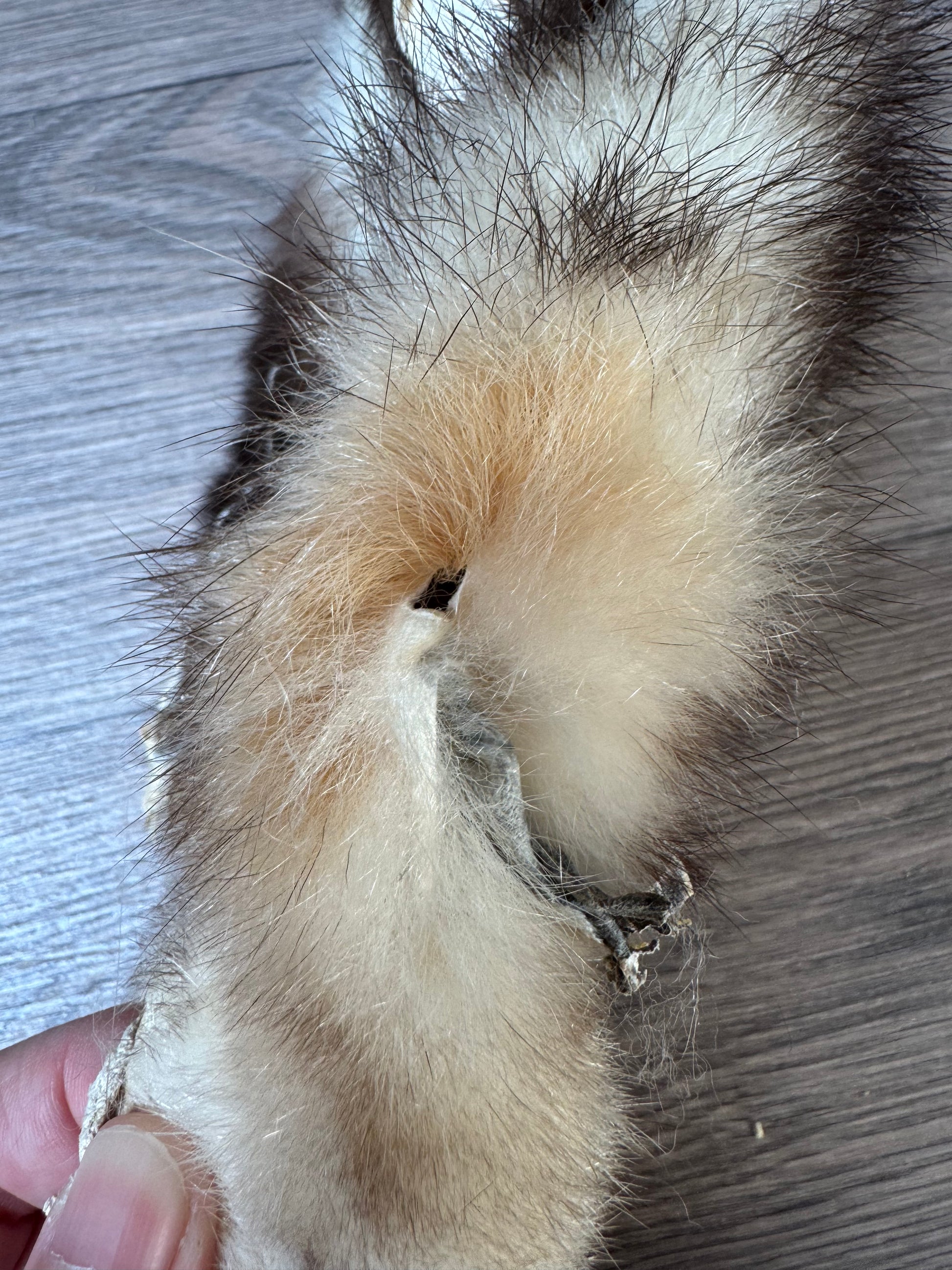 Please note opossum hands/paws are quite delicate. It’s hard to remove bones from the toes so they have been left in on some toes. The rest of the paw does not have any bones. Ears are left unturned on some of the opossums and need to be shaped when the mount is drying. The anus and sometimes the genitals of this batch of opossums has been cut away by the person who skinned them. For a lifesize mount you will need to make alterations to the form or else the skin won’t close.