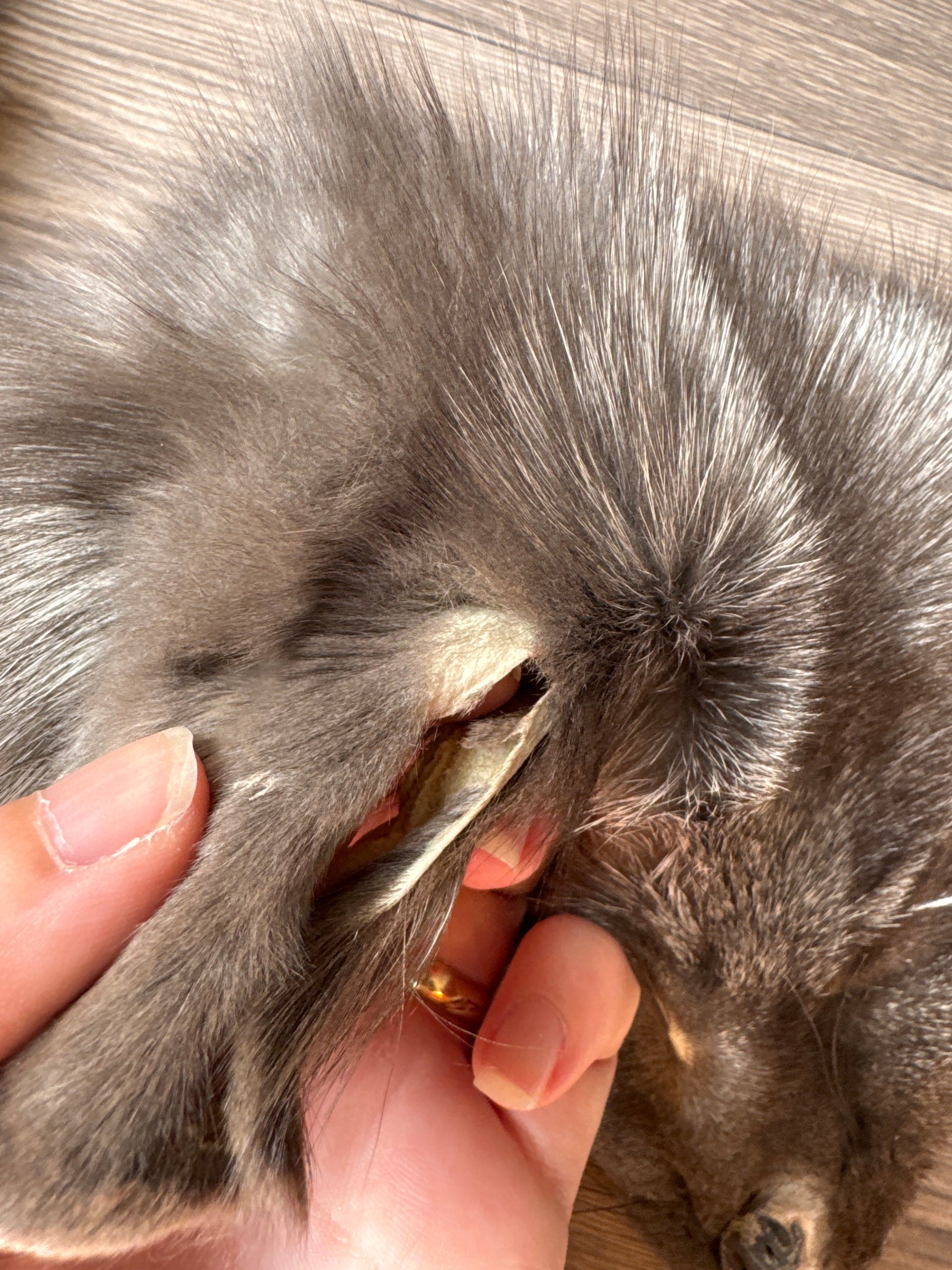 - One side of the shoulder is slightly thinner furred than the other side. Barely noticeable