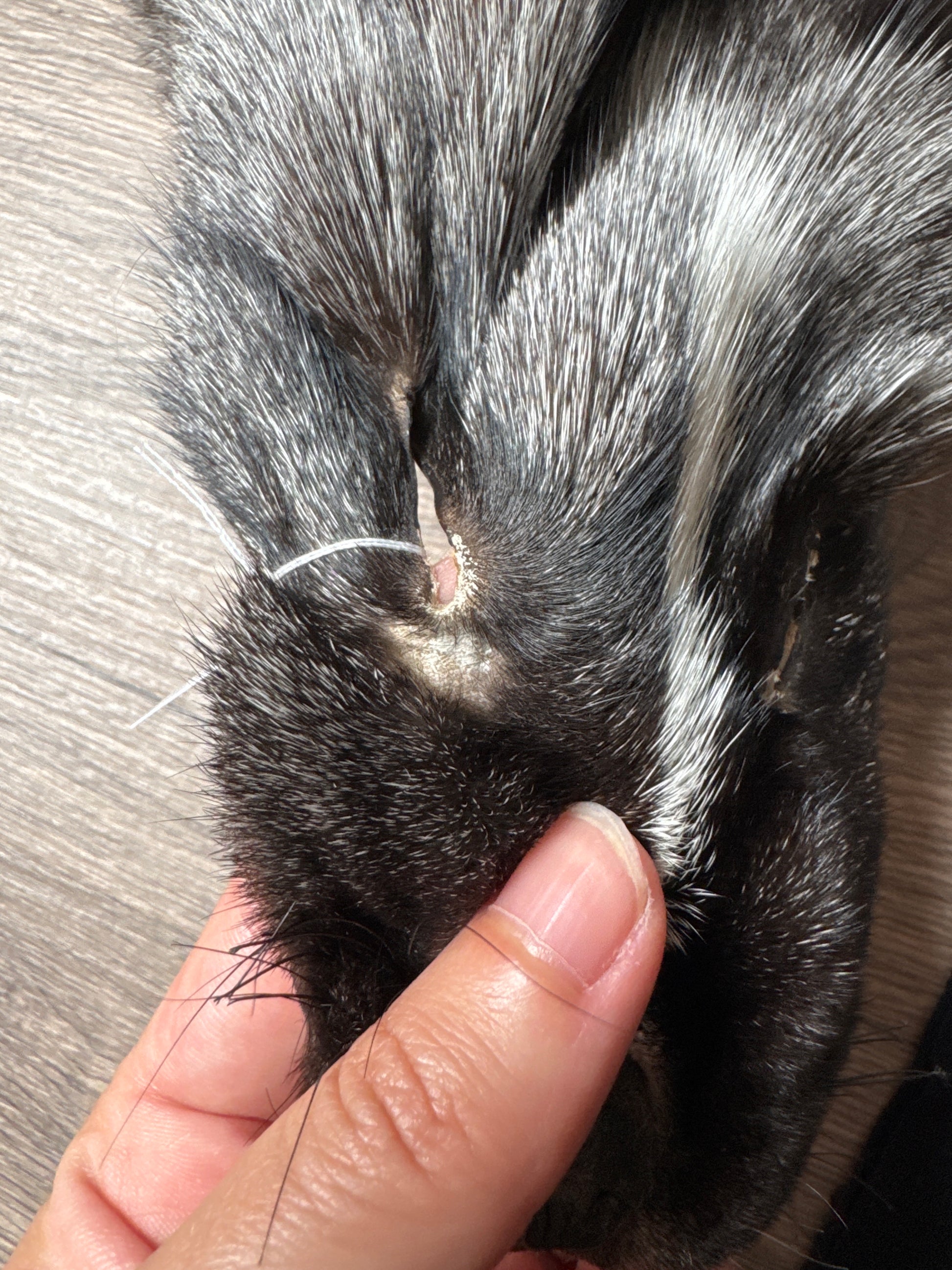 - Two small cuts in leather from staples where the pelt was stapled to the drying board